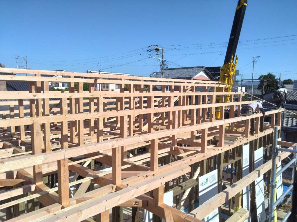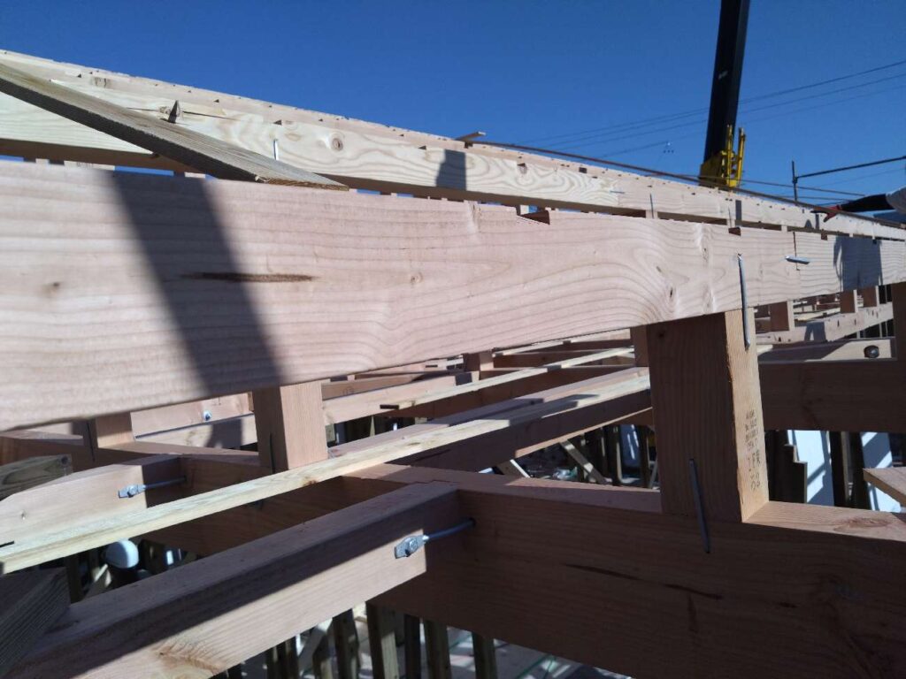 上棟日の工程の中で、屋根の形が出来始める時に組上げる母屋(もや)が並んだ様子です。