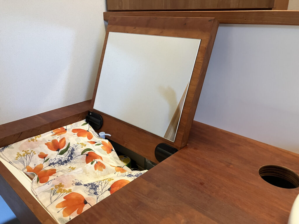 さらに、その開いた天板の裏面には鏡を設置。開くだけで