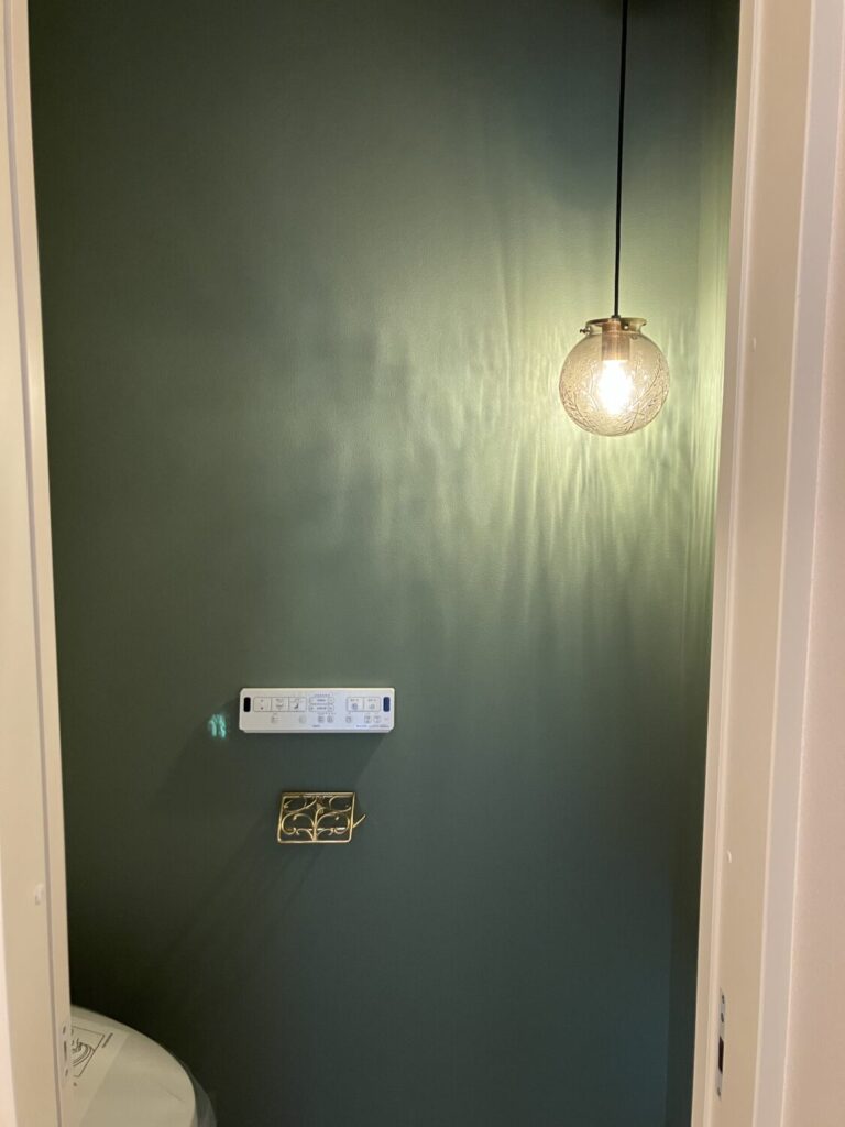 洗面のすぐ隣りのトイレはメキシコシンクのグリーンとそろえ、壁を全面グリーンにしました。
