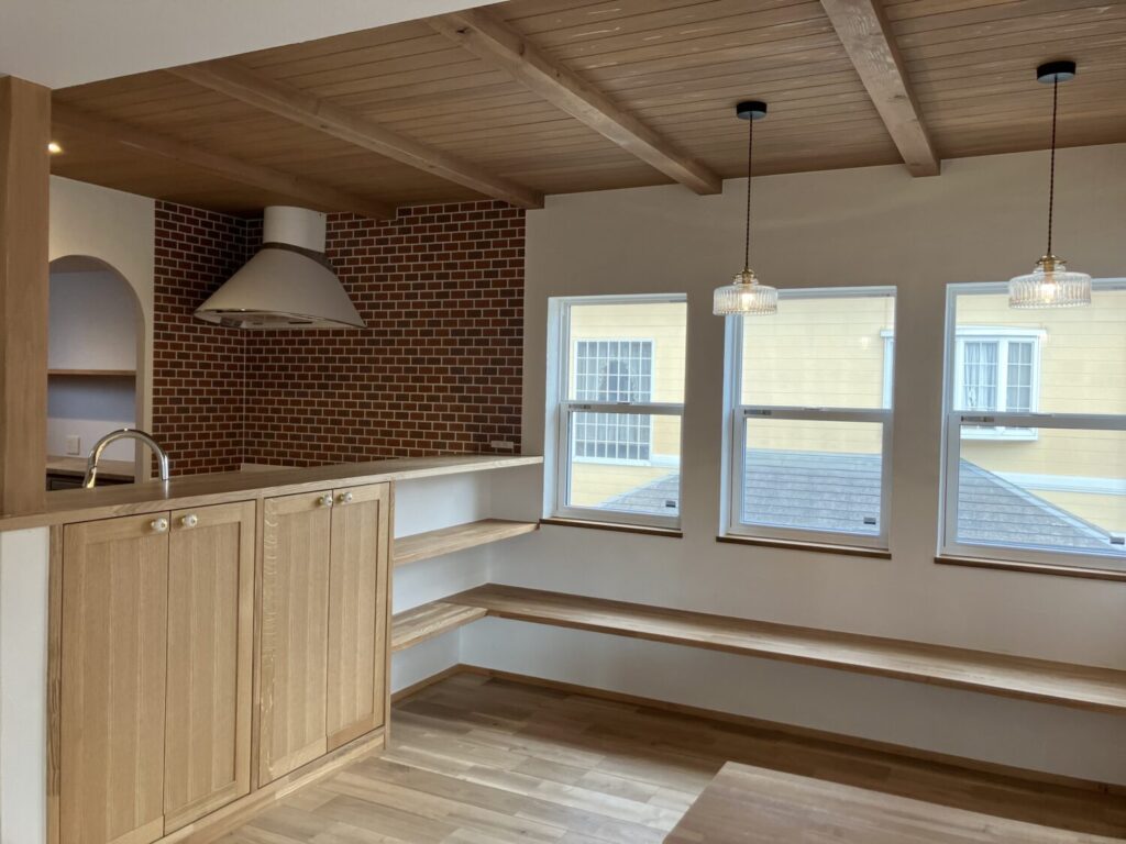 キッチンのコンロ前には、思い切ってレンガ調タイルを採用していただきました。