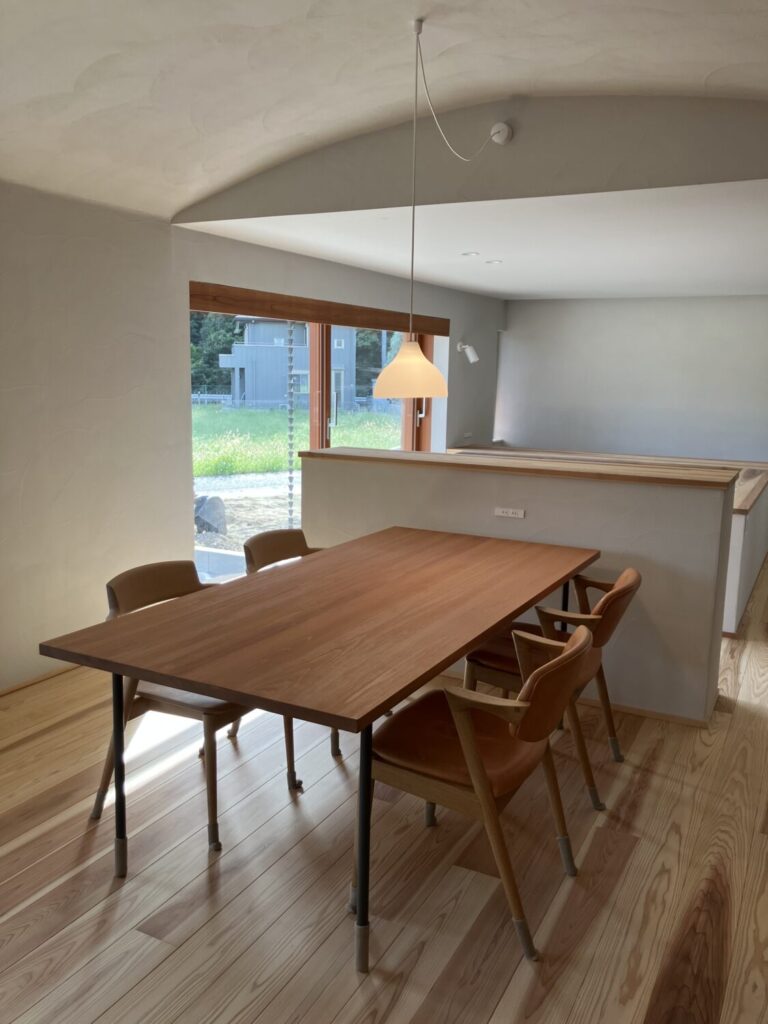 今回はダイニングの天井をアーチにしたこともあり、あえて壁からコードをたわませて取付ました。