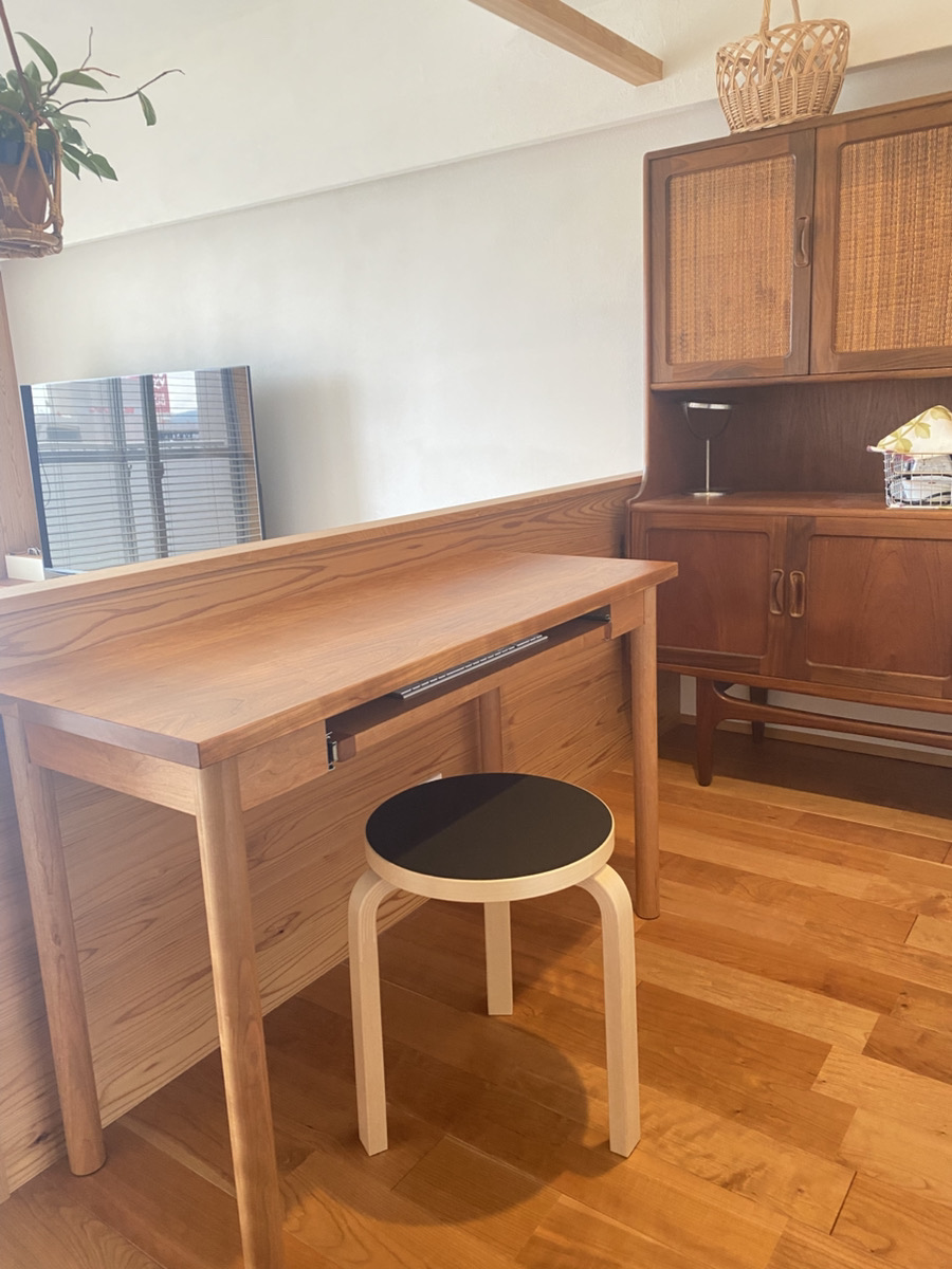 こんにちは。 オーパススタイルの小﨑です! 自宅に製作をお願いしていたデスクが届きました! 造作家具や置き家具にアメリカンブラックチェリーを使っているので、 樹種を揃えて製作してもらいました。 アメリカンブラックチェリーは、果物のアメリカンチェリーがなる木として知られる広葉樹です。 木目が美しく、滑らかですべすべの肌触りが好みです◎ そんなブラックチェリーですが、 天然木ならではの経年変化が他の樹種よりも特に早く、 劇的に現れることでも知られています。 色味が、深く飴色に変化していく特徴があります。 変化する期間も比較的早めで、 日当たりの良い場所では2~3か月も経てば 色の変化を目で見て気づくことができます。 木にはたくさんの種類がありますが、 硬い、柔らかい、経年変化で黄色くなる、赤くなる、 木それぞれの特徴を知っていると 見ているだけでも楽しくなります! もともと使っていたデスク奥のカップボードの樹種はチークなのですが、 飴色に経年変化をしたアメリカンブラックチェリーと色が馴染みそうなので、 今後の変化が楽しみです! どんな経年変化をしたか、またの機会にご紹介しますね。