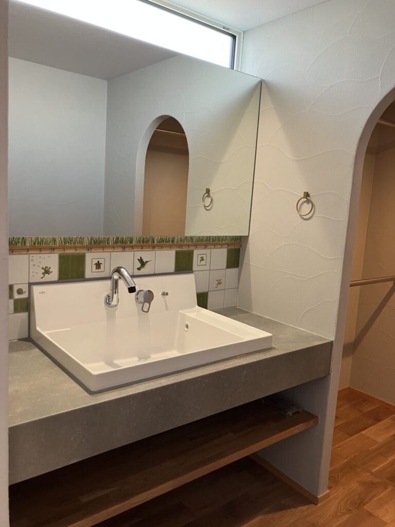 洗面は水辺をイメージして、水草や竹を組み合わせながらデザインしています。