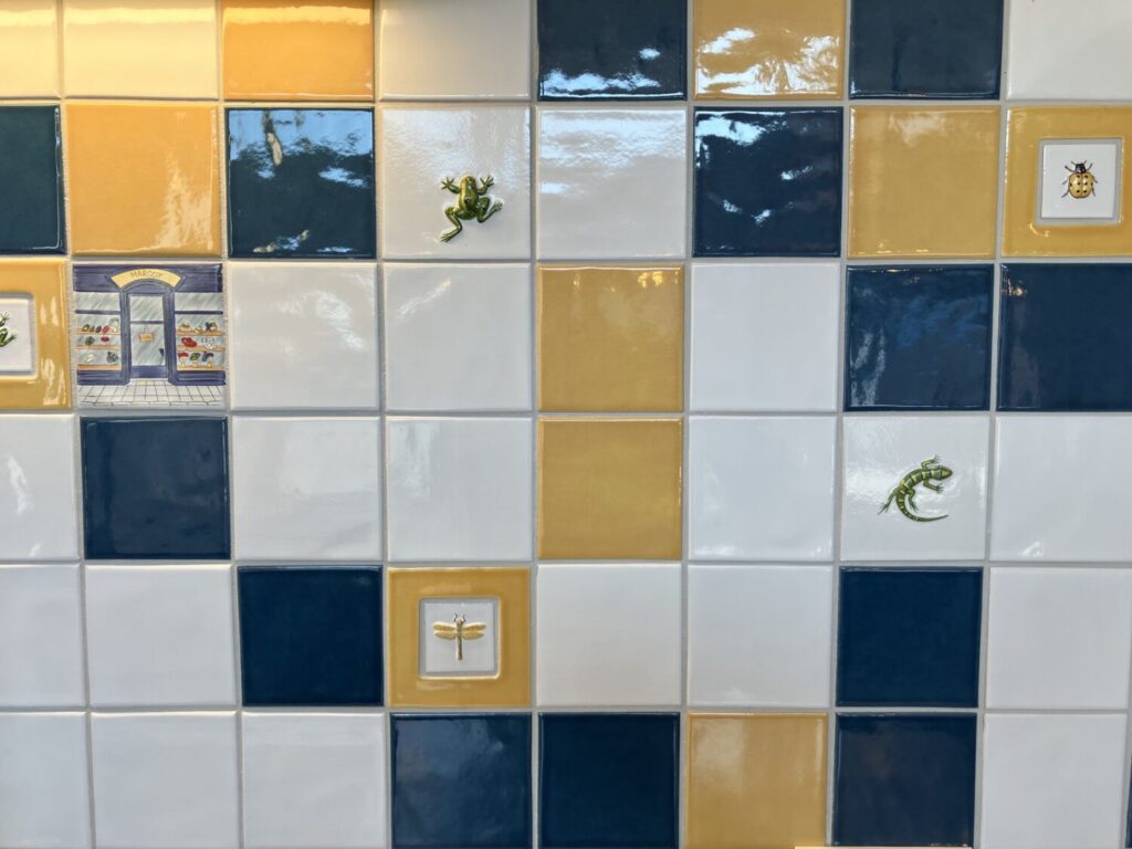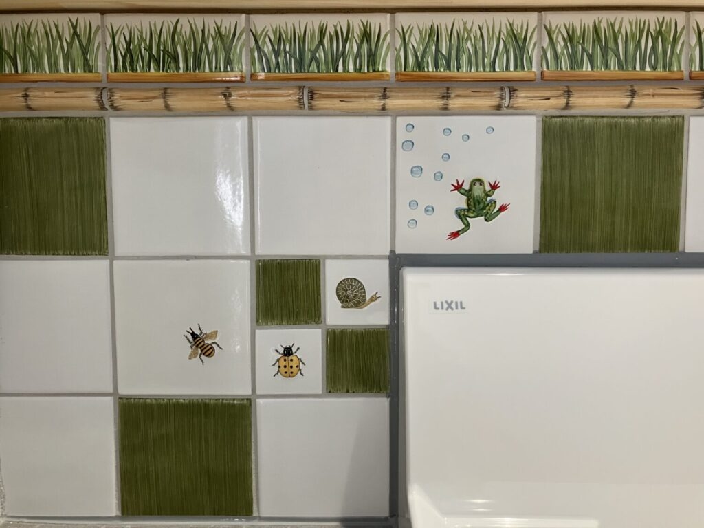 キッチンは、インディゴブルーとヤマブキ色をベースカラーにして、ハチやトカゲやカエルをちりばめました。