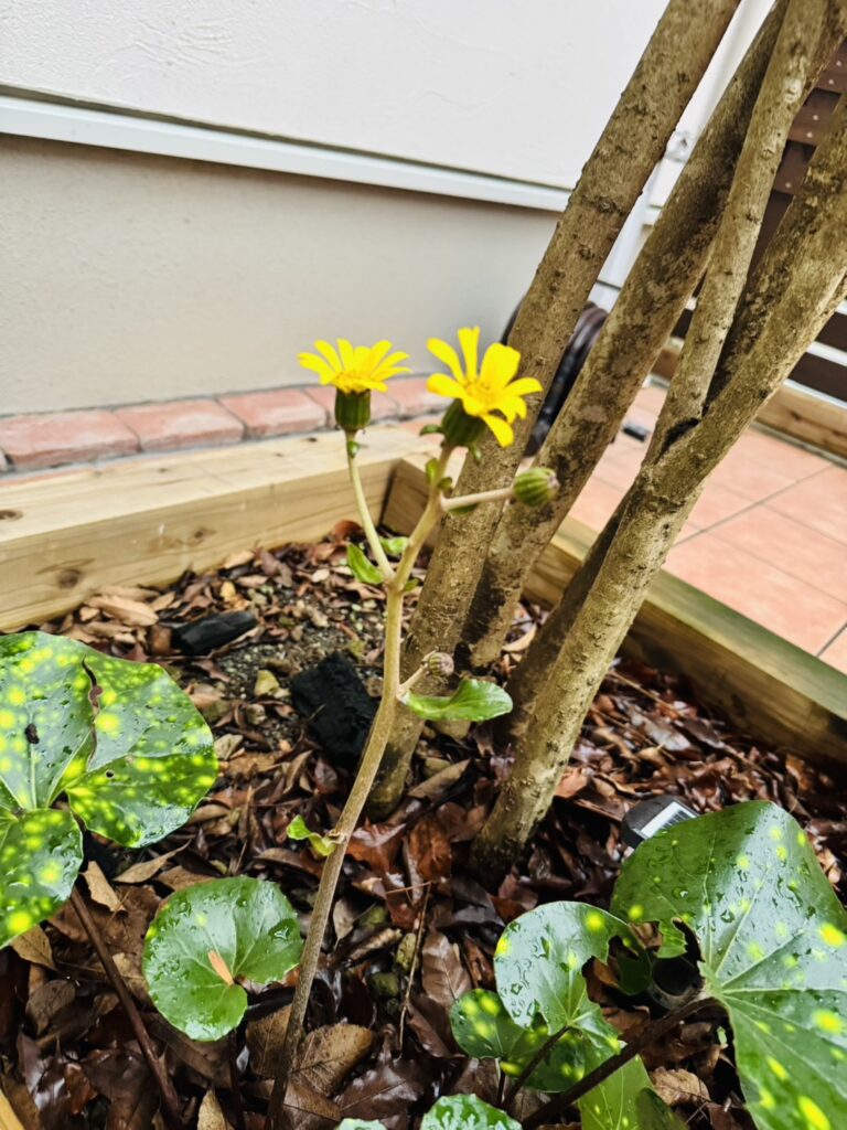 朝から忙しい我が家でしたが、そんな中中庭のツワブキに黄色い花が咲いているのを娘ちゃんが発見!!
