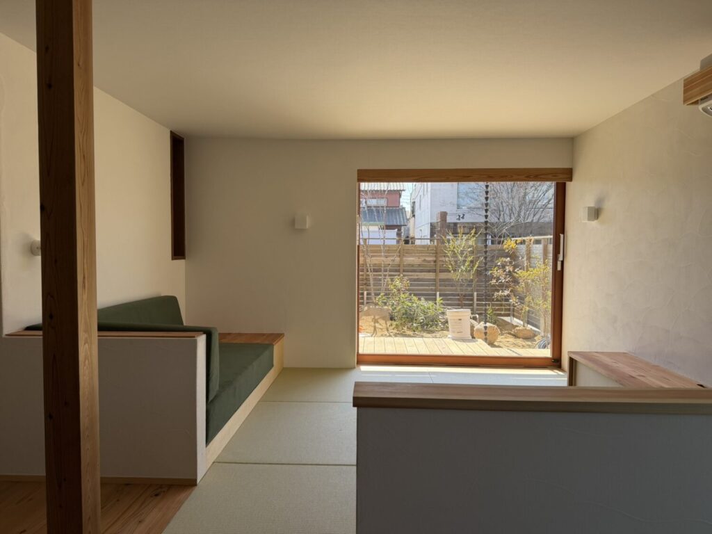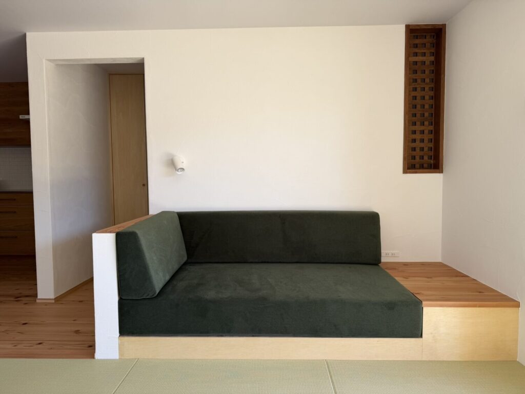 深みのあるグリーンのファブリックは、畳の若草色、塗り壁の白、無垢材の温かみと自然に調和。