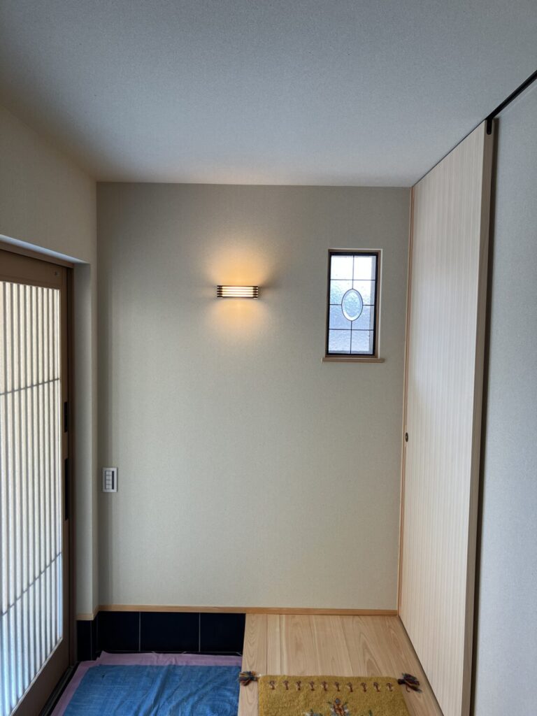 新しくなった玄関には、解体前の家で大切に使われていたアンティークのステンドグラスを配置しました。