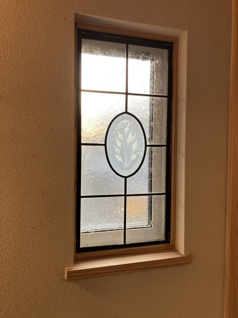窓からの光を受けて明るく煌くステンドグラスが、和風のスッキリとした空間のアクセントになって素敵です。