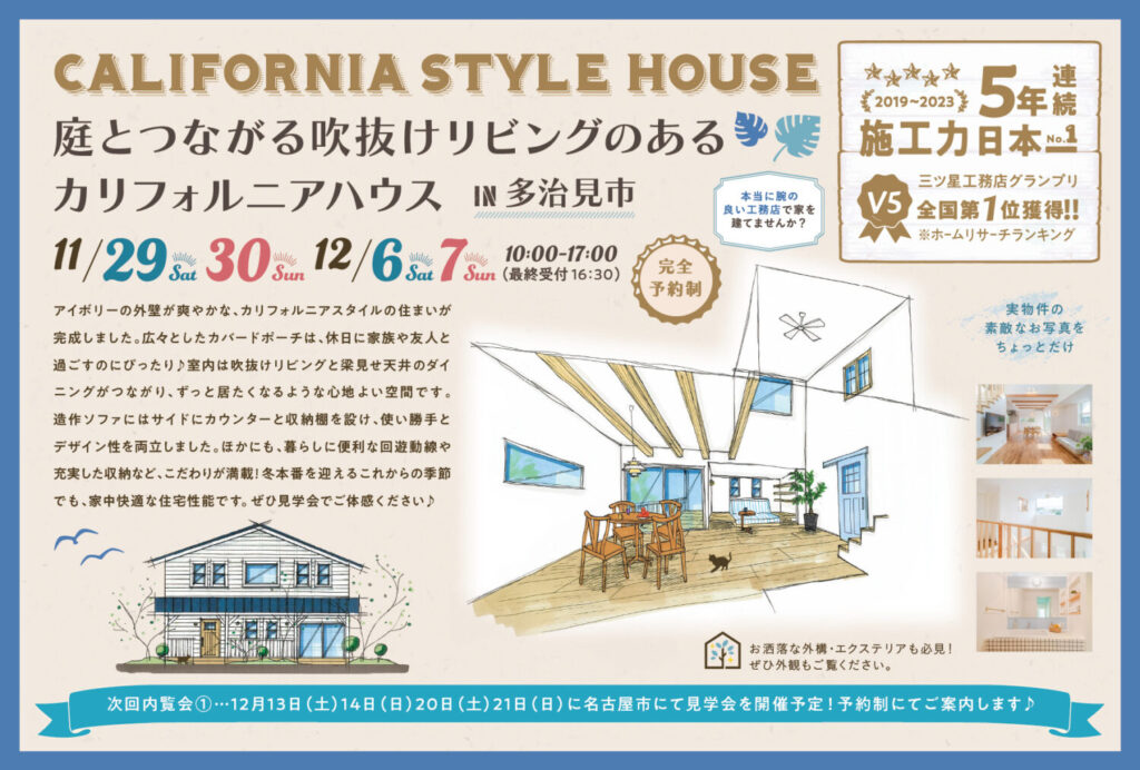 11/29(土)30(日)12/6(土)7(日) 庭とつながる吹抜けリビングのあるカリフォルニアハウス in 多治見市