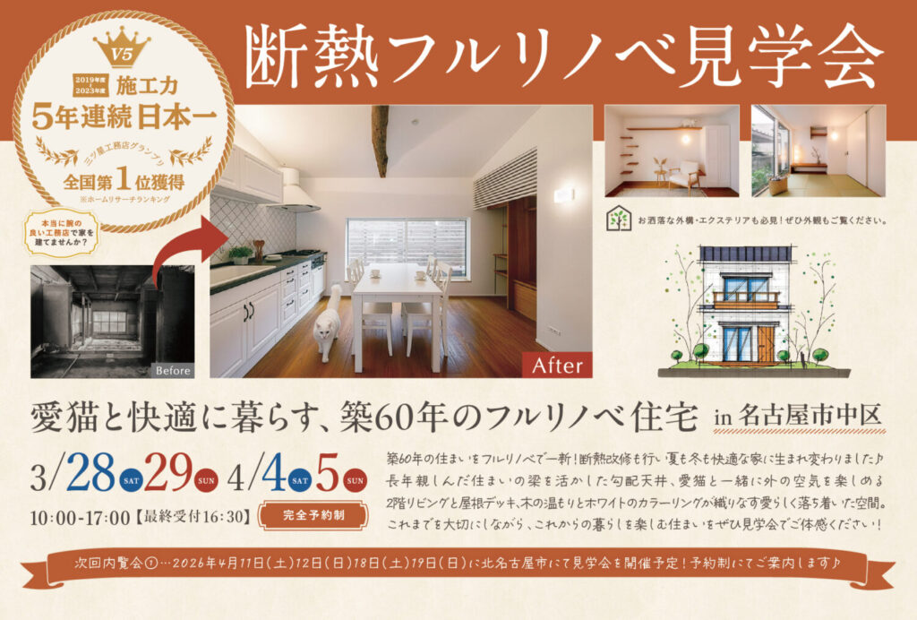 3/28(土)29(日) 4/4(土)5(日) 築60年 愛猫と快適に暮らす、断熱フルリノベ in 名古屋市中区