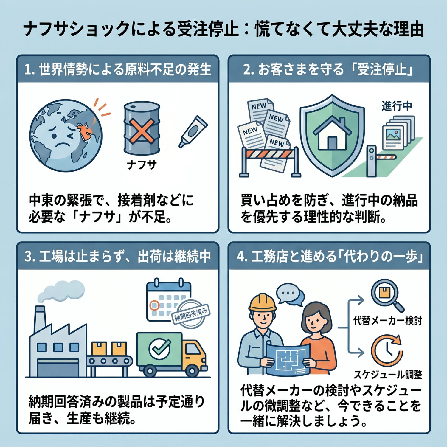 TOTO受注見合わせの背景には、中東情勢によるナフサ不足という世界規模の問題があります。ただ、生産・出荷は継続しており、メーカーの動きは市場を守るための早期の交通整理です。「もうどうにもならない」という状況ではありません。
