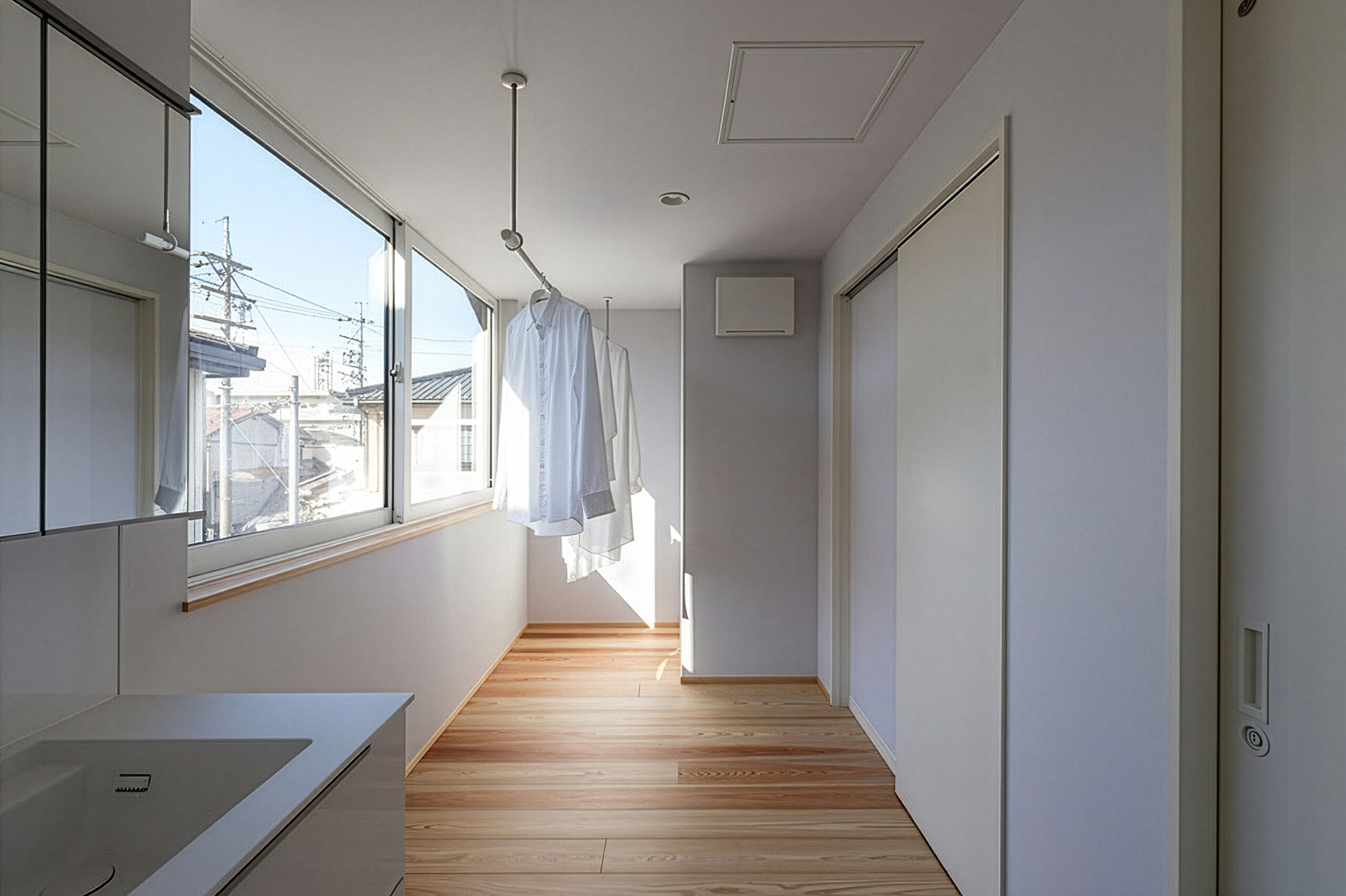 大開口・高窓で明るく計画したランドリールーム。洗濯の一連の流れがひとつの場所で完結する、毎日使いやすい動線です。