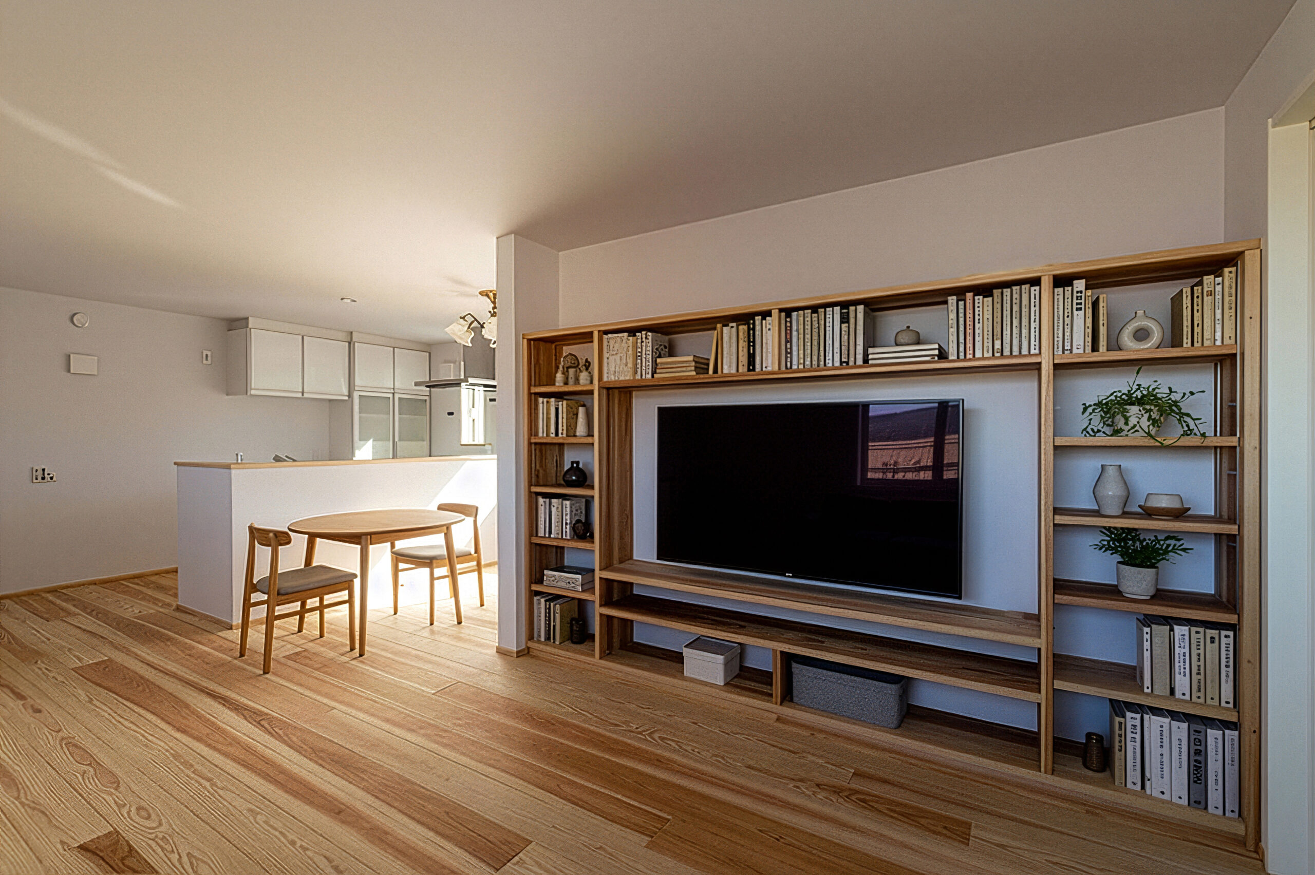 扉・棚・建具を造作で統一することで、色数を抑えながらも温もりのある空間に。細部までこだわってつくり込んでいます。
