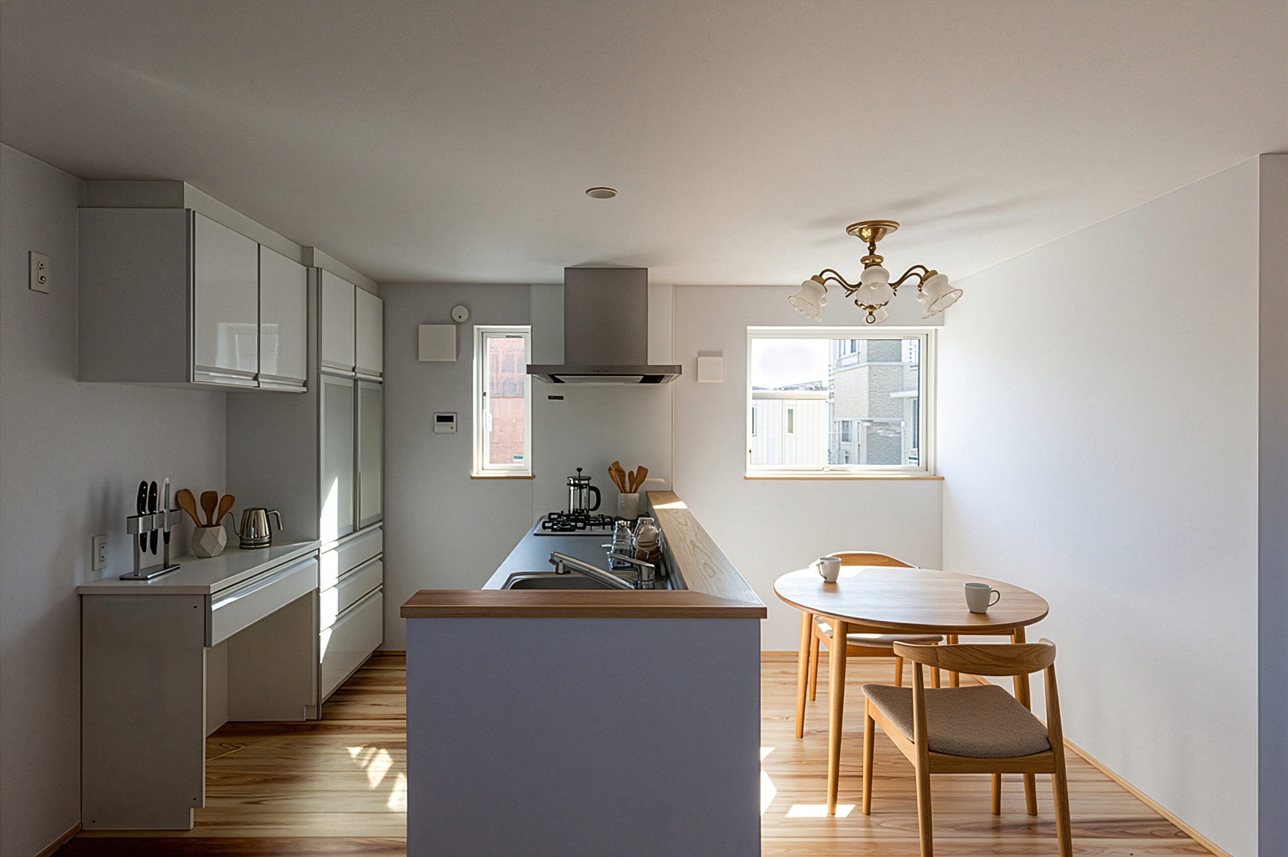 扉・棚・建具を造作で統一することで、色数を抑えながらも温もりのある空間に。細部までこだわってつくり込んでいます。