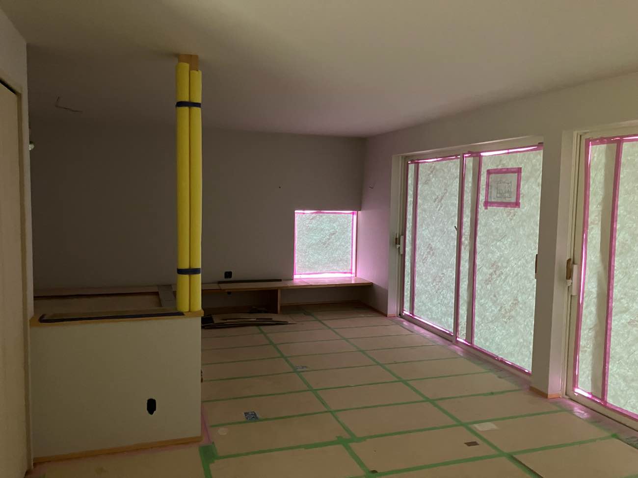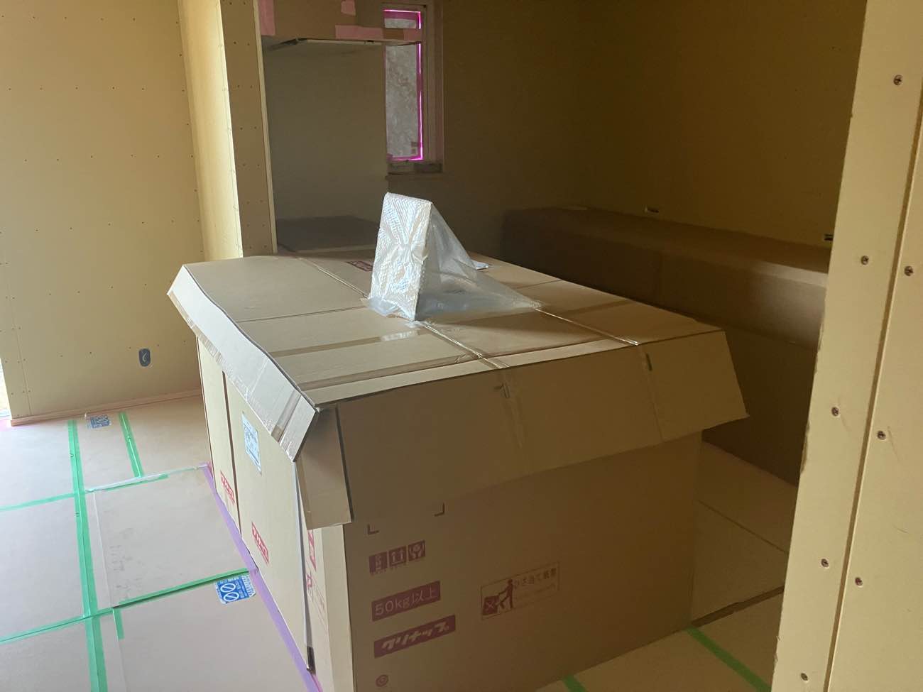 内部の造作作業では壁材の施工が進み、部屋の広さが見えてきました。