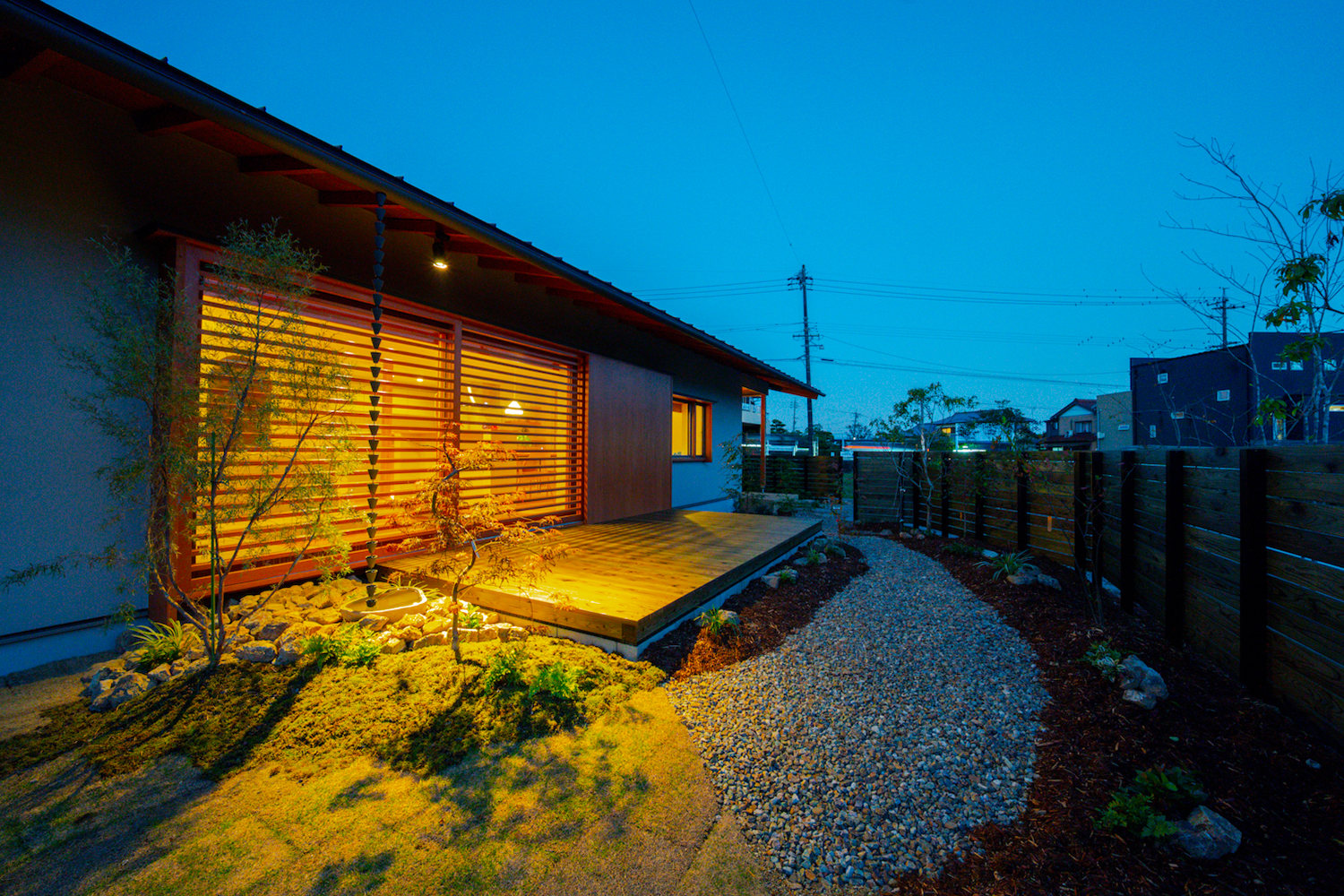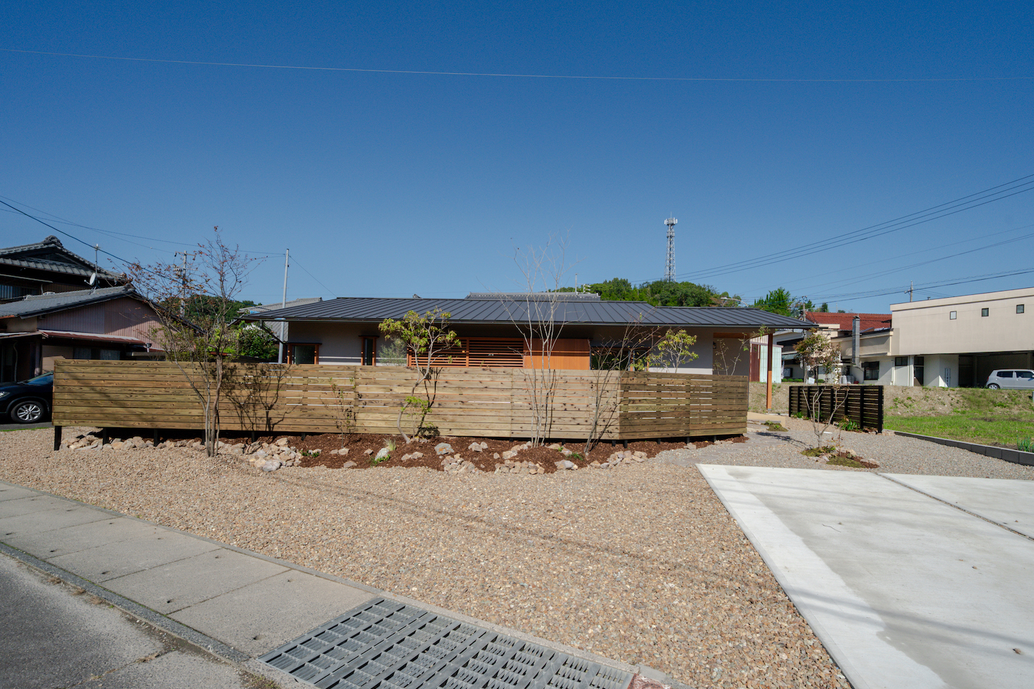 駐車スペースは2台分を確保しつつ、砂利部分にも1台分の余裕があります。来客時にも安心です。庭には植栽を配し、ウッドフェンスで視線をほどよく調整しています。奥行きのあるウッドデッキもあり、外で過ごす時間が自然と増えていきそうです。軒を深く取っているため、窓を開けて過ごしやすく、雨がかかりにくいのもいいですね。