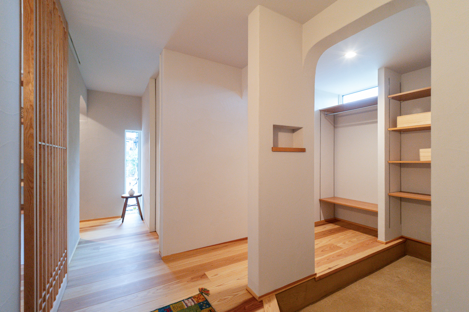 玄関に入ると、まず感じるのはゆったりとした広さ。外のポーチから続くたたき仕上げで、和のテイストと土の素材感がそのまま室内へとつながります。ベージュ系の色合いでまとめられ、家全体にやわらかな印象を与えています。下足箱は低めに設けられており、視線が抜ける分、実際以上に広く感じられるのも特徴です。奥にはシューズクローゼットがあり、棚やハンガーパイプも備えられているので、日常使いもしやすそうですね。