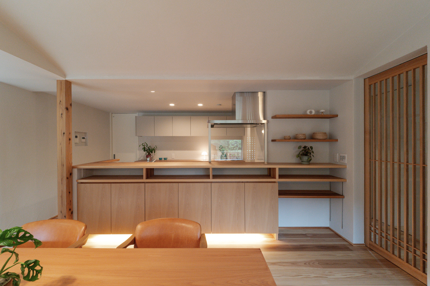 キッチンの前には、幅約4mの造作棚を設置しました。下部には間接照明が仕込まれており、夜になるとやさしい光が広がり、昼間とはまた違った表情に。扉付き収納と飾り棚を組み合わせているので、しまう・飾るが両方楽しめます。