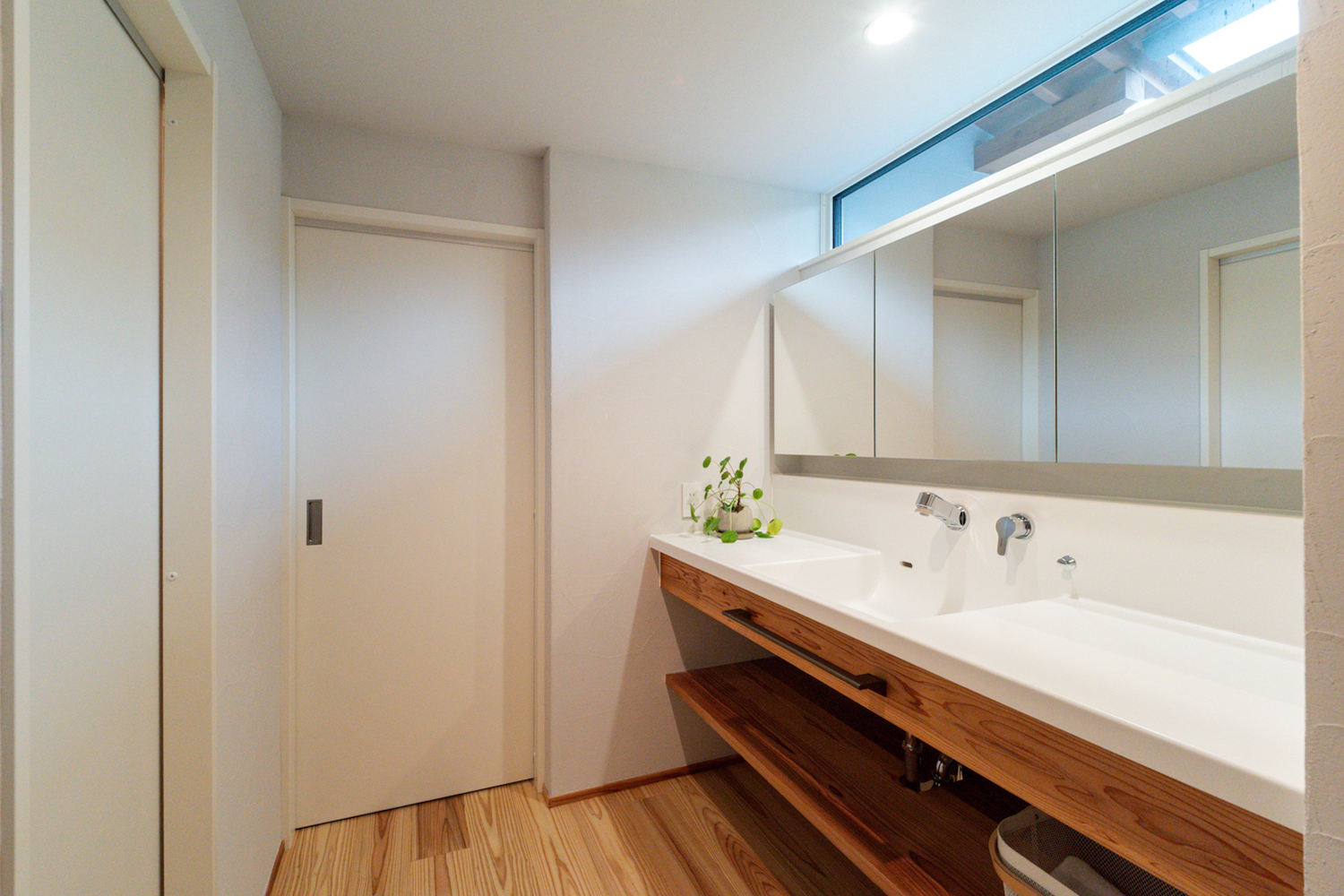 洗面スペースは、メンテナンス性を考えたユニットタイプの洗面台に、造作の棚を組み合わせたつくり。収納付きの幅広三面鏡で、朝の身支度もスムーズに進みそうです。ファミリークローゼットと隣接しており、そこからリビングへ抜けられる動線も便利ですね。