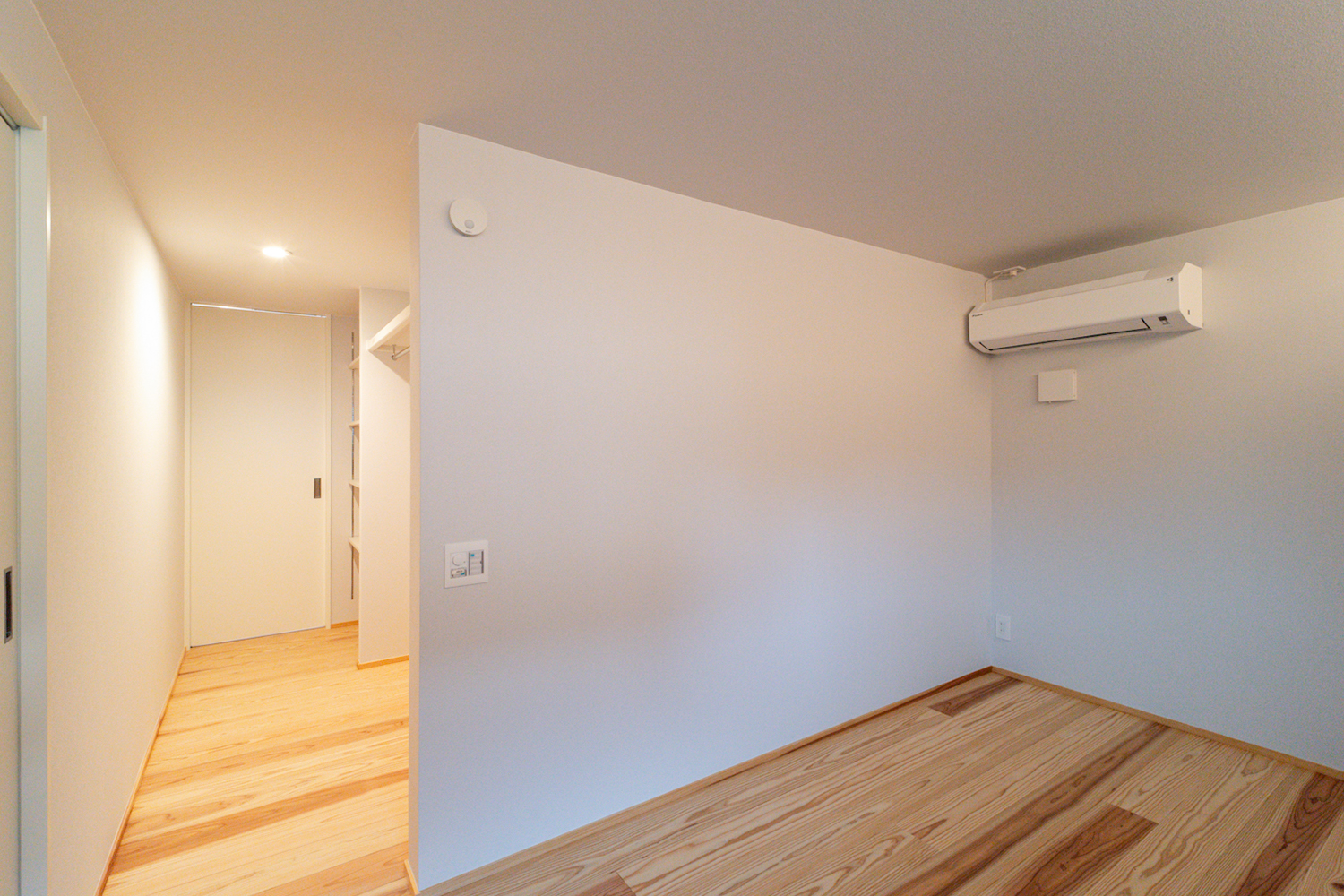 LDKの一角にある扉を開けると、ウォークインクローゼット兼廊下を通って寝室へ。天井高を抑え、間接照明を取り入れることで、気持ちが切り替わる落ち着いた空間に仕上がっています。その先は洗面やトイレなどの水まわりにつながっており、日常動線としても便利。このほかにも洋室が2部屋あり、家族構成や暮らし方に合わせて使える個室が用意されています。