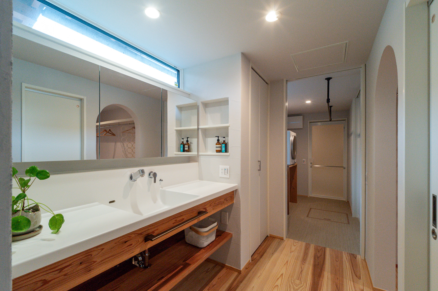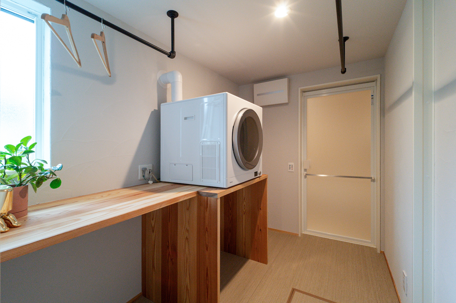 洗面の隣には脱衣室を設け、ランドリールームとしても使えるよう、ゆとりを持たせた設計です。乾太くんやハンガーパイプ、作業カウンターを備えており、洗う・乾かす・畳むまでがこの空間で完結します。さらに別の扉からキッチンへもつながっているため、家の中を回遊しながら、無駄なく移動できる動線に。情緒を大切にしつつ、日々の暮らしやすさにもきちんと配慮された住まいです。