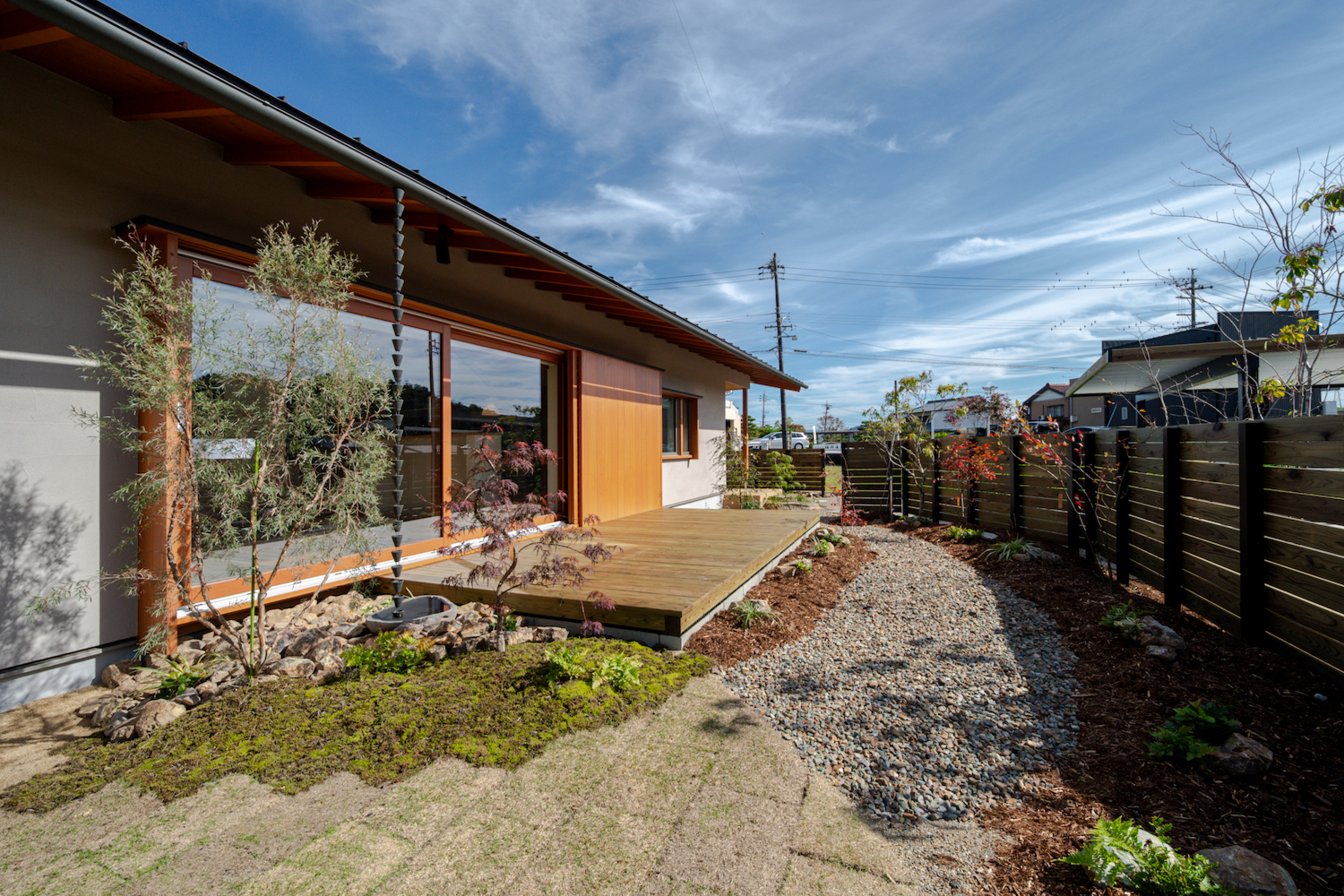 外観は、水平ラインがきれいに出る、落ち着きのあるデザイン。エクステリアも、周囲の風景となじむよう、やさしいトーンでまとめられています。アプローチには石や苔を取り入れ、さりげなく趣を感じられる仕上がりにしました。
