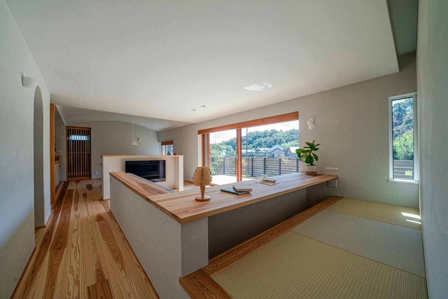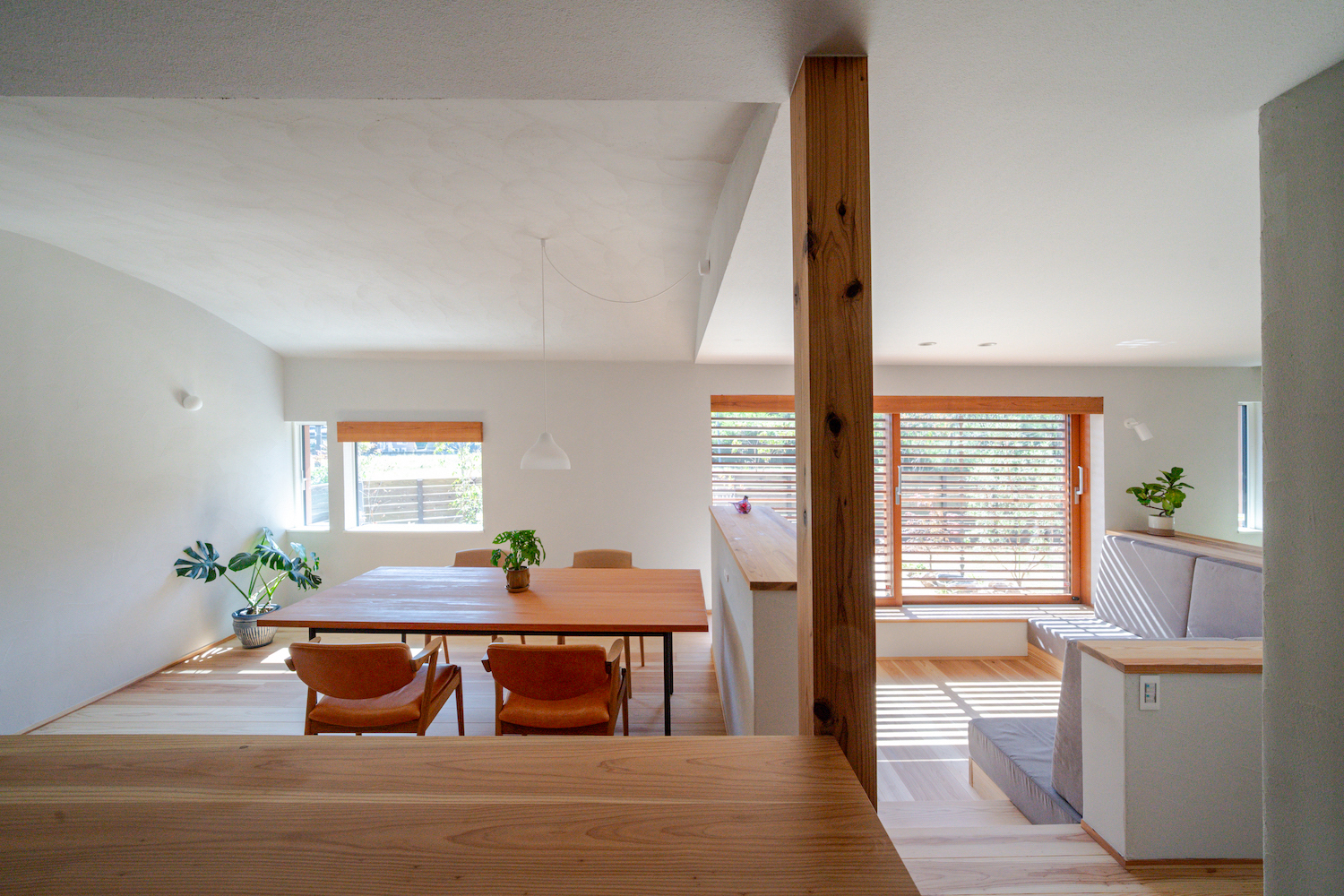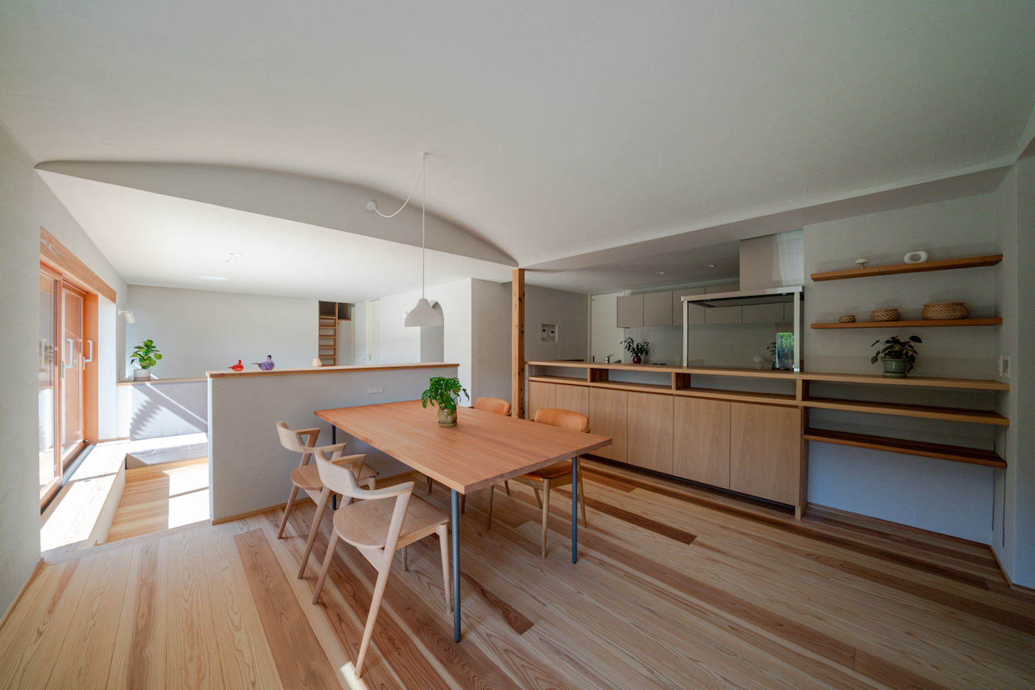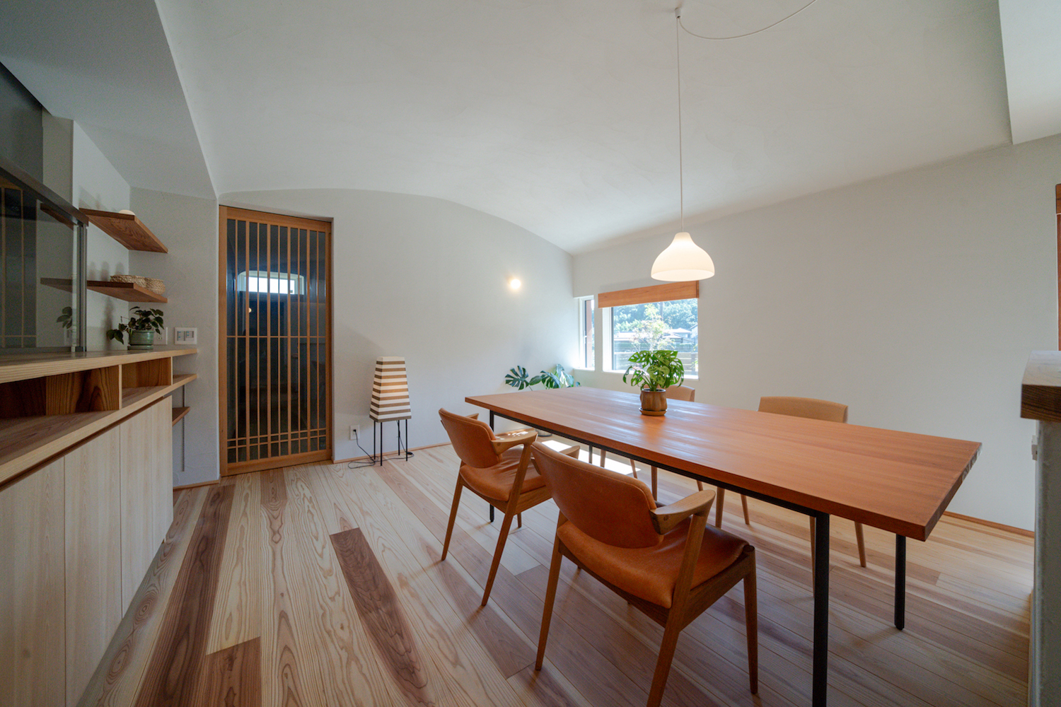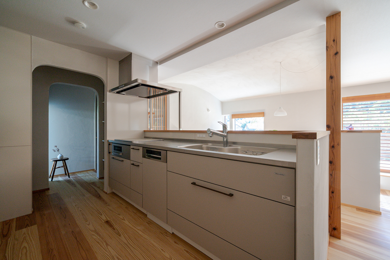 LDKへ進むと、まず目に入るのはダイニングスペース。アーチ状の天井が、空間をやさしく包み込むような安心感を演出しています。天井も壁と同じ塗り壁となっており、全体にまとまりのある空間です。ダイニングスペースは、あえて大きな窓を設けず、FIX窓と換気用のスリット窓のみにすることで、食事の時間を落ち着いて楽しめます。
