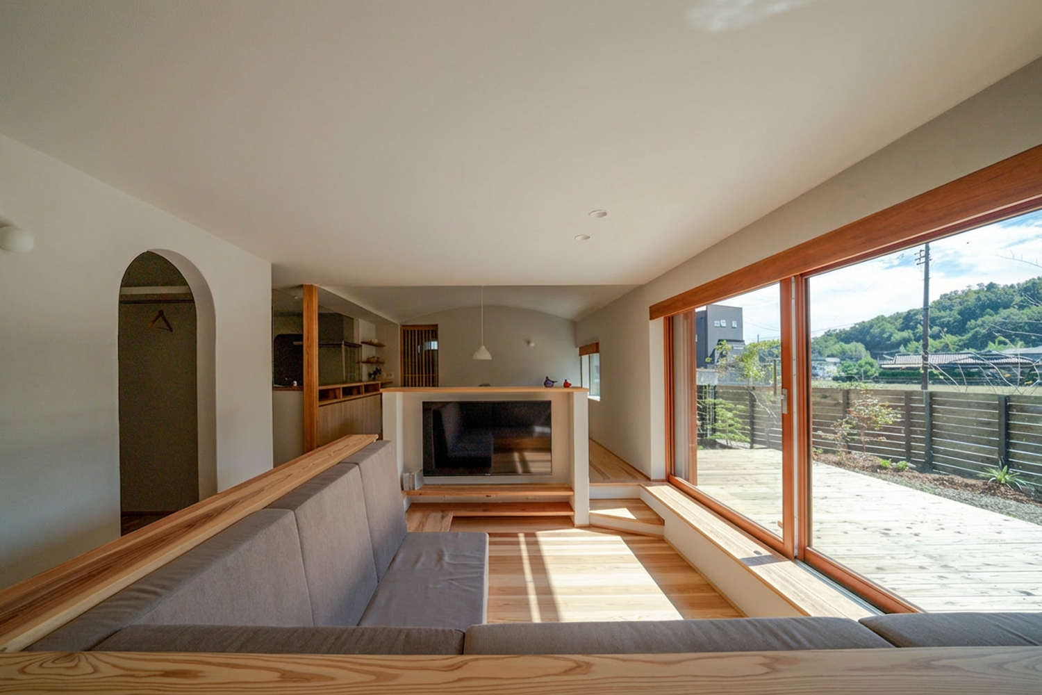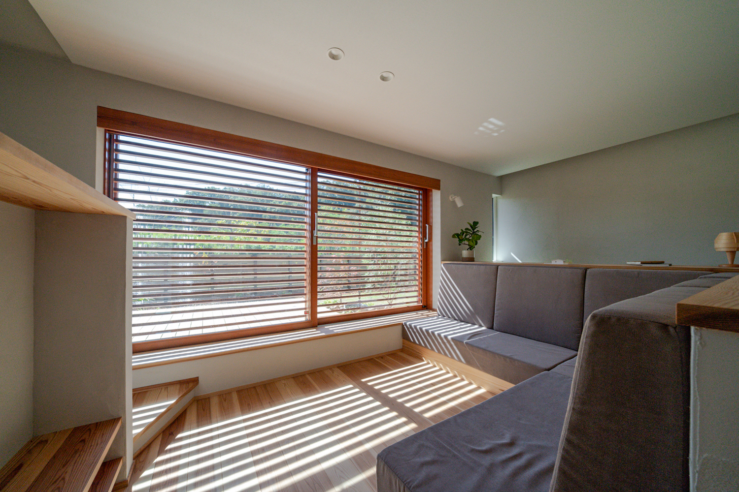 リビングは一段下がったピットリビング。造作のハイバックソファに座ると、視線が自然と下がり、外からの視線が気になりにくくなります。正面には大きな木製サッシがあり、2枚とも引き込むことができるため、全開にするとウッドデッキと室内がひと続きに。網戸は横格子タイプで、風を通しながら虫の侵入を防げる仕様です。