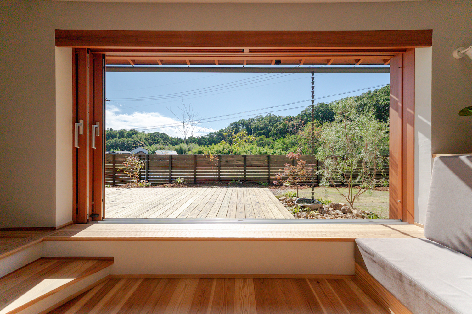 窓を開けると、ウッドデッキから庭、その先の自然までが一体に感じられます。雨の日や季節の移ろいを、室内にいながら楽しめるのも、この住まいならでは。奥行きのあるウッドデッキでは、お茶を楽しんだり、お子さんのプール遊びをしたりと、過ごし方もいろいろ広がります。
