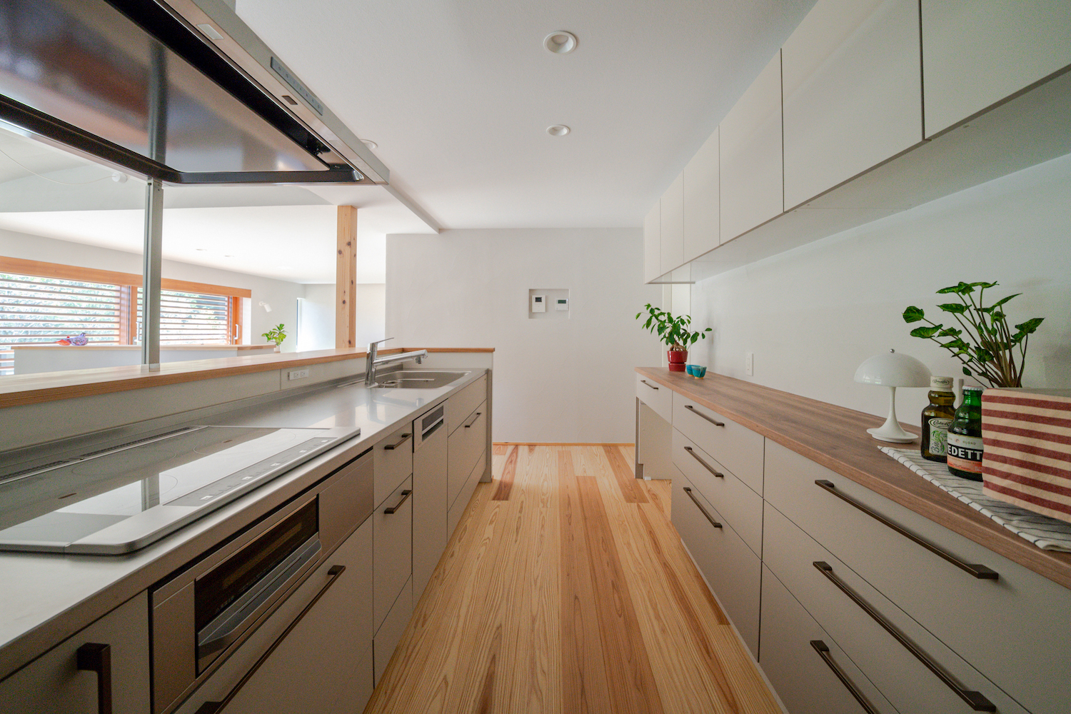 キッチンは、カウンターを高めに設計され、生活感が表に出にくい工夫も。キッチンに立つと、ダイニングのFIX窓やリビングの木製サッシ越しに、自然の景色がふっと視界に入ります。料理をしながらでも、外の気配を感じられるのは嬉しいですね。キッチン横にはパントリーがあり、そこから廊下へ抜けられる回遊動線。移動がスムーズで日々の暮らしが便利になります。